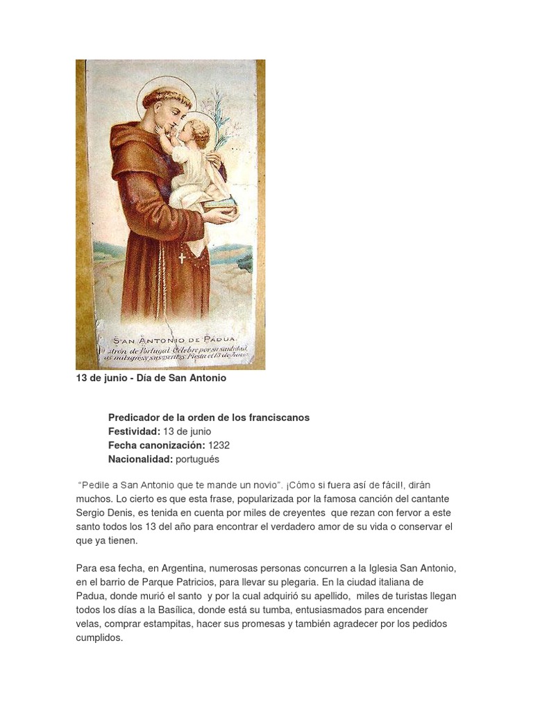 3 from Pone siempre a cristo en el centro de la vida y del pensamiento, de la acción y de la predicación. Él, en cambio, quería ser pobre por amor de cristo y por eso se hizo franciscano. Cada 13 de junio le rezamos a san antonio de padua ante su imagen en un altar y lo agasajamos con flores y velas. Su festividad se celebra el 13 de junio. Un año después de su muerte fue beatificado. Junio 12, 2019 09:00 isabel orellana vilches testimonios. Él, en cambio, quería ser pobre por amor de cristo y por eso se hizo franciscano. Y allí murió ese día con fama de santidad.